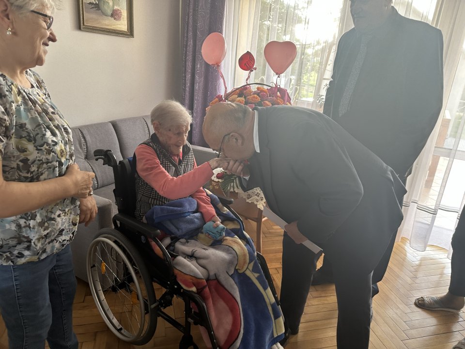 Z tej okazji dostojną Jubilatkę odwiedził Wójt Gminy Wiżajny Stanisław Jacek Pietrukiewicz. W imieniu swoim oraz całej społeczności Gminy złożył najserdeczniejsze życzenia, wręczając pamiątkowy list gratulacyjny, bukiet kwiatów oraz upominek.